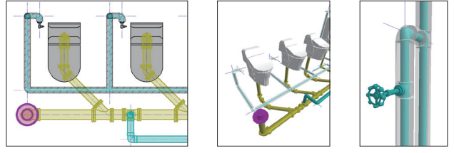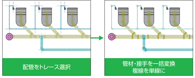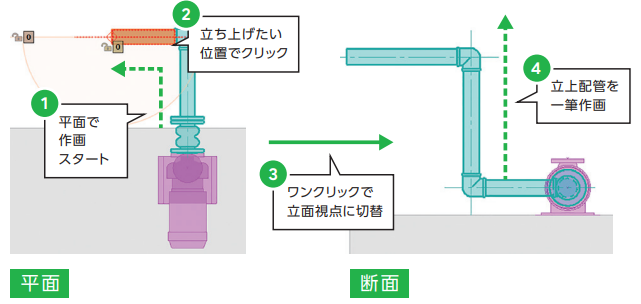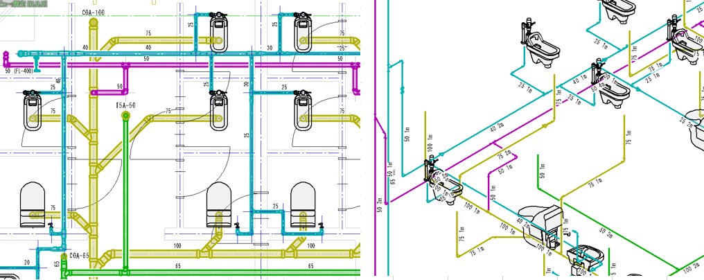給水点や排汚水点から適切なサイズでの配管作画できます。