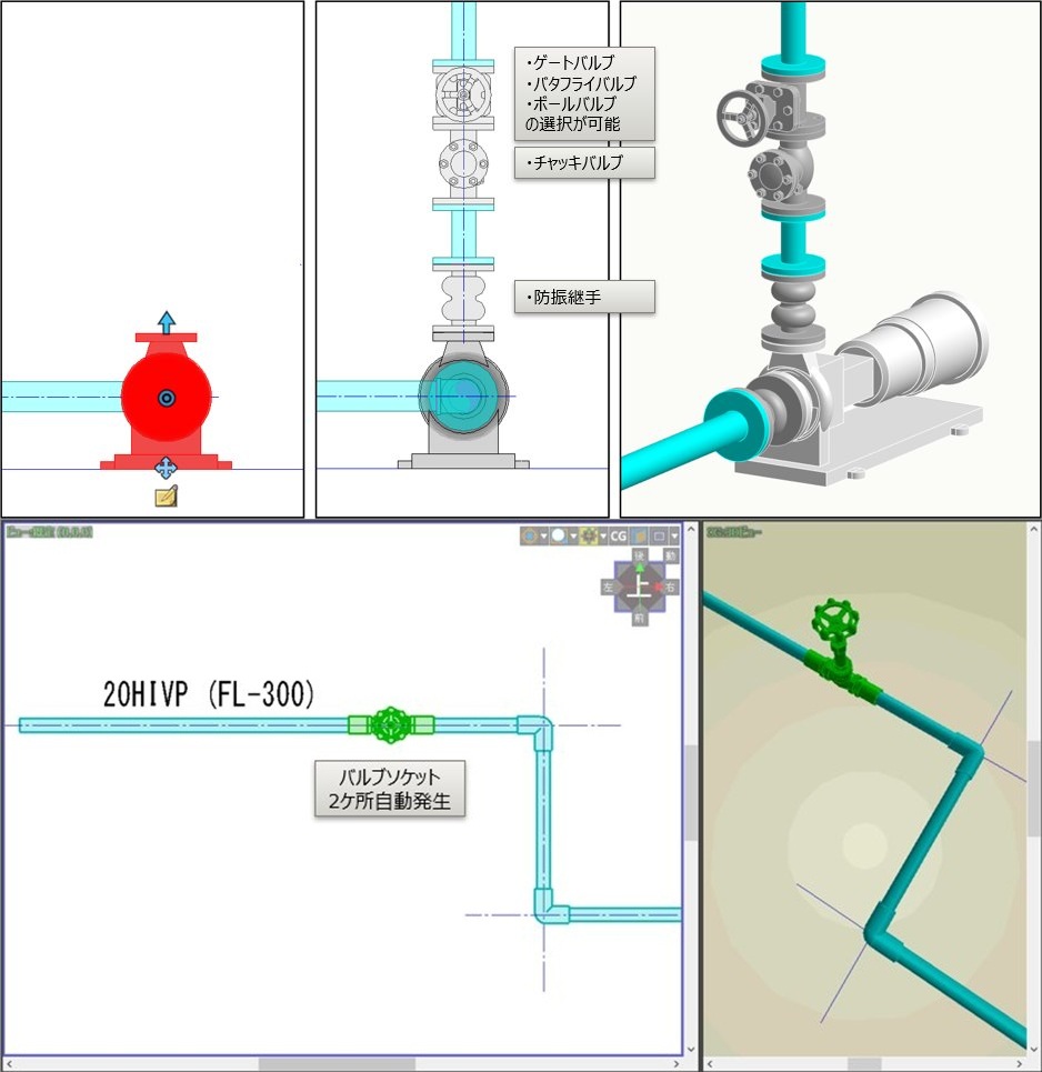 ほかにもビニル管にネジ込みバルブを配置した際、自動でバルブソケットを作画します。