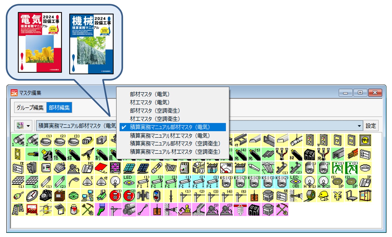 「積算実務マニュアル電気設備工事」・「積算実務マニュアル機械設備工事」掲載の材料を